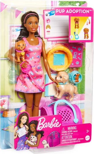 - Includes Barbie doll, puppy, dog, carrier, small certificate, large certificate, leash, potty mat, dog bed, dog bowl, bottle, dog food box and dog treat