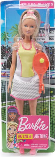 Explore a world of competitive fun with the Barbie® Tennis Player doll! When a girl plays with Barbie®, she imagines everything she can become, and if you love to play sports, you can be a tennis player! The Barbie® Tennis Player doll wears a chic tennis outfit featuring a yellow middle stripe, patterned skirt and pink piping. Then to get into full "swing," Barbie® Tennis Player doll has a tennis racket and ball—ready to score! Tennis players use quickness, agility and hand-eye coordination on the court and strive to be the best they can be! Kids will love the endless possibilities for creative expression and storytelling fun with the Barbie® Tennis Player doll.