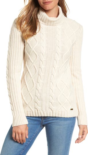 An Aran-style front panel and ribbed cable-knit sleeves nod to the Scottish heritage of the brand on a cozy turtleneck sweater styled with leather elbow patches.