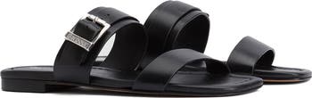 A buckle at the instep strap features shiny logo-debossed hardware on a slide sandal that will complement your weekend-ready looks.