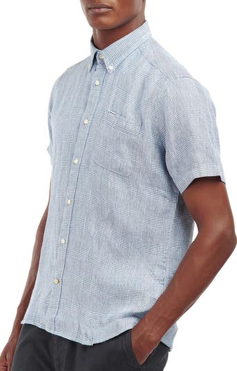 Micro houndstooth adds a sophisticated twist to this short-sleeve plaid button-down shirt cut from breezy linen in a tailored fit.
