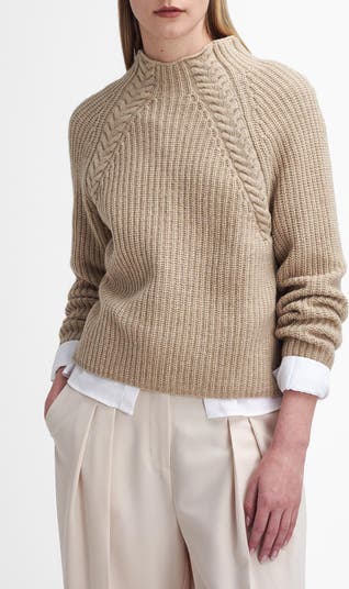 Cable stitching highlights the raglan sleeves of this chunky, ultracozy sweater knit with a funnel neckline from warm wool-blend yarns.