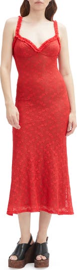 Channel '90s It Girl style with this lace midi dress featuring a ruffle-trimmed sweetheart neckline.