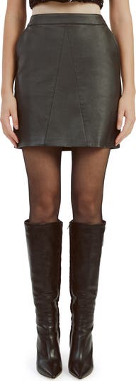 Dial up the sass in this smooth faux-leather miniskirt fashioned with angled front seams and handy slant pockets.