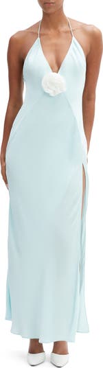 A contrasting rosette detail highlights the plunging neckline of this event-ready halter gown designed with an airy open back and a leg-baring slit.