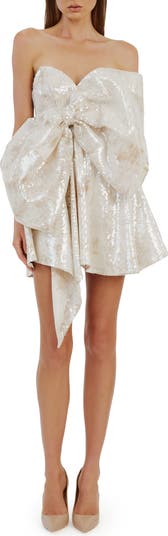 Serve up drama and extravagance in this strapless minidress with a statement-making bow in front and light-catching sequins all over.