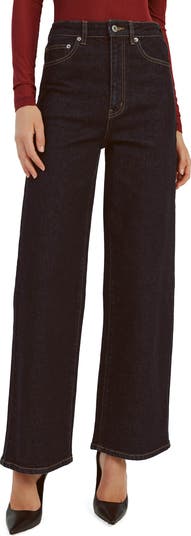 Flaunt retro-chic style in these fabulous dark-wash jeans made from low-stretch denim and featuring a superhigh waist and full-length, figure-elongating wide legs.