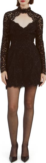 This fit-and-flare minidress crafted from gorgeous floral lace is updated with a diamond cutout at the bodice.