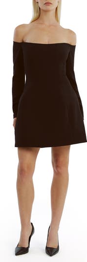 Make an entrance in this minidress featuring a flirty design with an off-shoulder neck, a fitted bodice and structured boning. A balloon skirt brings an element of drama and volume.