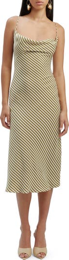 Allover stripes enliven this slinky slipdress designed with a drapey cowl neck and slender adjustable straps.