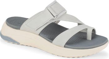 Built-in arch support and multilayered cushioning ensure all-day comfort to this slide sandal secured with an adjustable hook-and-loop strap for a snug fit.
