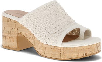 A cork-inspired heel and platform bring unmistakable summer style to a slide sandal topped by a wide knit strap to bring rich texture to your look.