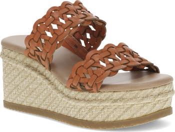 Woven faux-leather straps and a striped midsole further the whimsical styling of this slide sandal balanced upon a platform-wedge heel.