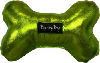 This luxury dog toy is shaped after their favorite treat and shimmering in a bright metallic hue.