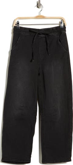 A stretchy waistband lends comfort and ease to denim pants cut with barrel legs to bring on-trend style to casual looks.