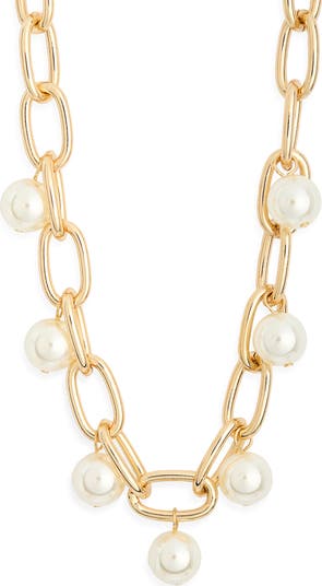 Lustrous faux-pearl baubles put a statement-making spin on this paper-clip chain necklace polished to a high shine.