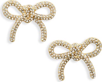 Channel the coquettish aesthetic by flourishing your lobes with these brightly polished studs shaped like knotted bows while shimmery pavé completes your look.