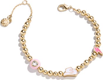 Bring forth the good vibes with this beautiful beaded bracelet that glows with a golden finish and glimmers with trio of playful charms.