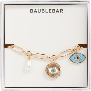A glossy faux pearl and sparkly crystals illuminate this evil-eye charm bracelet that brings boho-chic shine to your day.