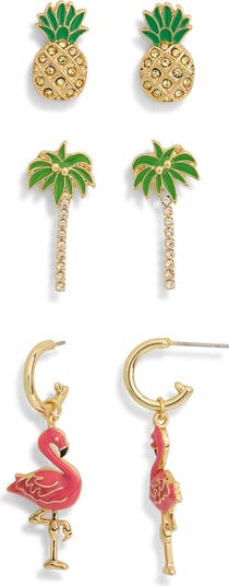 A whimsical set of earrings shimmer with sparkling CZ stones shaped into playful vacation-inspired motifs for a fun, summery finish.