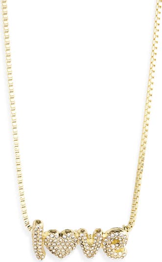 Bright-white crystals shine along the bubbly letters strung on a delicate chain necklace that brings a sweet finishing touch to everyday looks.