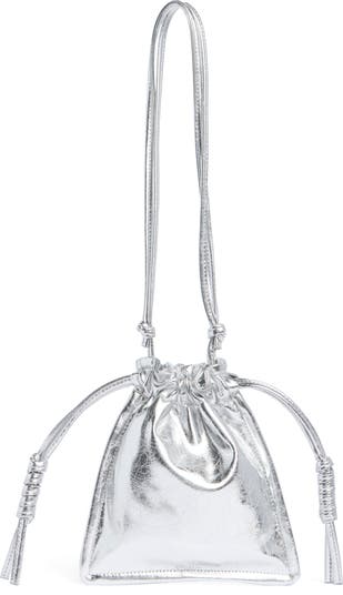 Crafted for both fashion and function, this gleaming metallic bag offers an adjustable shoulder strap and slim silhouette topped with a drawstring opening.