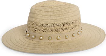A row of pearlescent embellishments shine brightly along the grosgrain ribbon that encircles a panama hat crafted from interwoven straw.