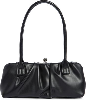 Soft gathering creates a pillowy texture on a slim shoulder bag suspended from wide, tubular straps for comfort throughout carry.