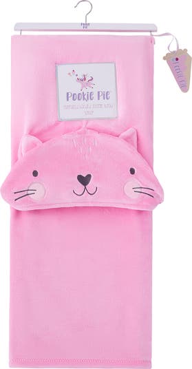 A cheerful cat-themed hood amplifies the snuggly vibe of a plush throw blanket that comes conveniently hung on a hanger for easy storage when not in use.