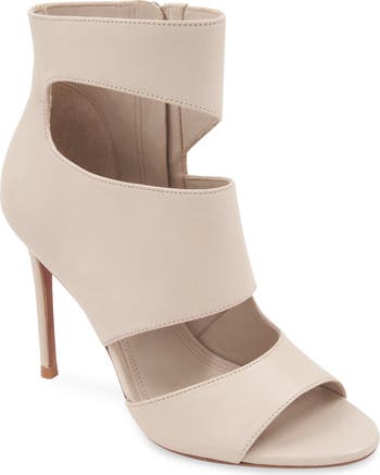 Geometric cutouts at the vamp and ankle create visual intrigue on a lofty sandal outfitted with a side zipper for easy entry.