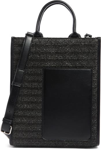 Whipstitched seams add a rustic finish to a soft, structured shoulder tote bag fashioned from woven raffia and framed with durable faux leather.