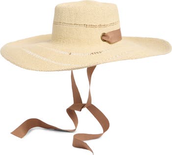 A grosgrain ribbon completes your look in this charming downbrim hat crafted from interwoven paper interrupted by airy open insets.