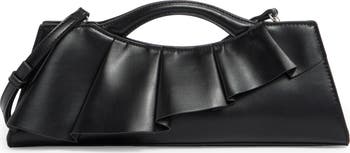 Asymmetric ruffles bring architectural intrigue to a faux-leather bag shaped in an east/west silhouette and suspended from an adjustable strap.