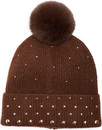Add a sparkling touch to your cold-weather look with this rhinestone-studded beanie topped with a fluffy faux fur pompom.