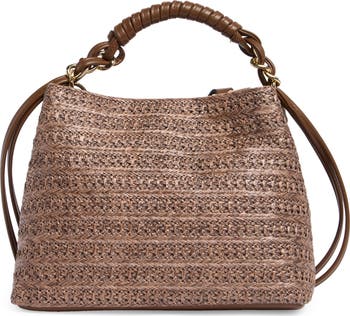 A woven exterior brings sunny-day charm to this compact satchel boasting a removable, adjustable crossbody strap and dual interior compartments.