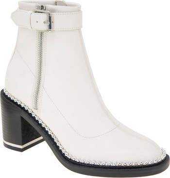 A buckle strap and ball studs at the welt lend moto edge to this block-heel bootie built for comfort with memory-foam cushioning and a breathable lining.
