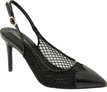 A sleek pointy-toe silhouette brings a powerful look to every stride in a slingback pump crafted from a mix of glossy faux leather and airy mesh.