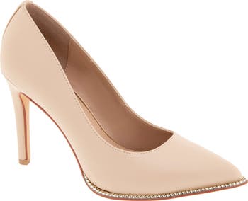 A gleaming segment of chain outlines the elegant pointed-toe silhouette of a timeless pump finished with a striking stiletto heel and casually cushioned footbed.