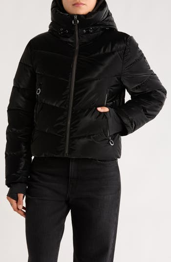 A glossy puffer jacket features a water-resistant design, an faux-fur lined hood and insulated channel quilting to help keep your cozy when the temps drop.