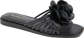 A dimensional flower appliqué highlights the strappy silhouette of an enchanting sandal grounded by memory foam cushioning.