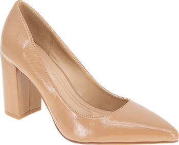 A pointy toe and wrapped block heel balance a polished pump set on a cushioned footbed for long-lasting wear.