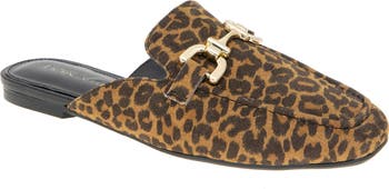 A polished bit offers a refined look in a mule boasting a squared toe for modernist styling.