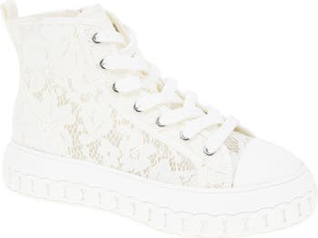 A delicate lace upper balances the bold design of this platform high-top sneaker featuring an easy-on side-zip closure for added utility.