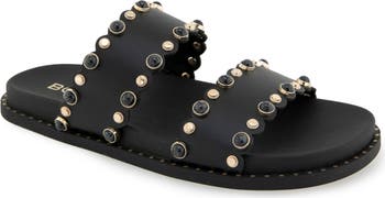 Studded hardware neatly outlines the wide vamp straps atop an easygoing slide made with plush cushioning to support each and every stride.