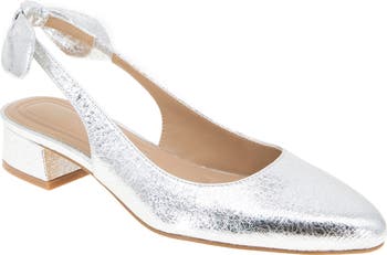 A pointy toe elongates this block-heeled pump that's secured with a slingback strap knotted in a darling bow.