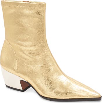 A gilt block heel provides a gorgeous finish for a pointy-toe bootie that's a standout addition to your footwear portfolio.