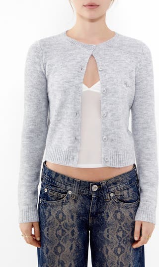 Brushed wool-kissed yarns create a fuzzy texture on this fitted crewneck cardigan featuring an embroidered logo at the chest.