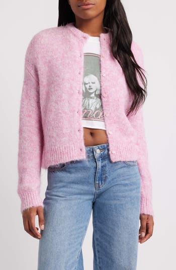 Brushed wool-kissed yarns lend a cozy texture to this crewneck cardigan complete with classic ribbed trim.