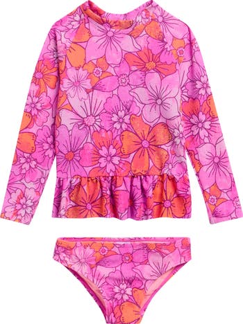 Your youngster will be splashing and playing happily in this two-piece swimsuit featuring a long-sleeve rashguard and coordinating bottoms.