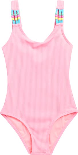 Pastel-hued beads add a pretty pop of color to the straps of a one-piece swimsuit made with plenty of stretch for beach-day comfort.